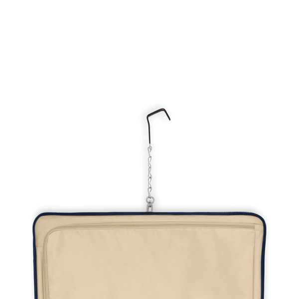Garment bag hook to hang on a door included for easy access to contents.