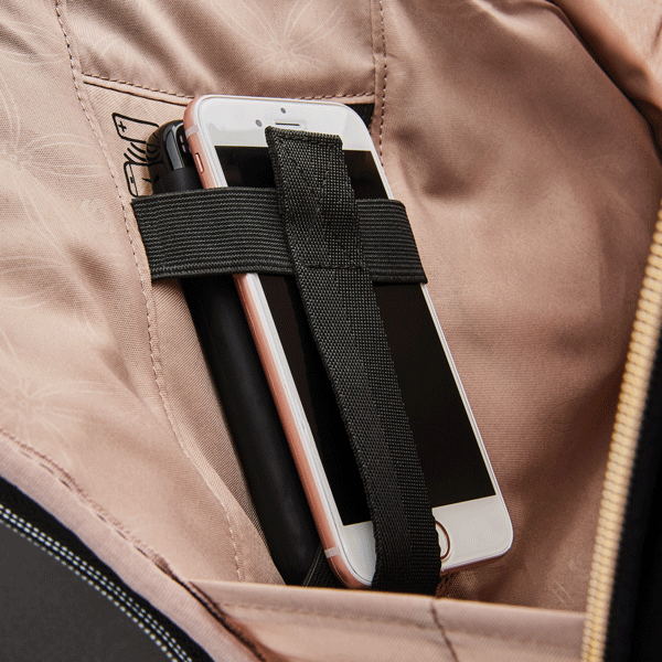 Special power hub includes a USB port and a pocket sized for wireless charging*. *Battery not included